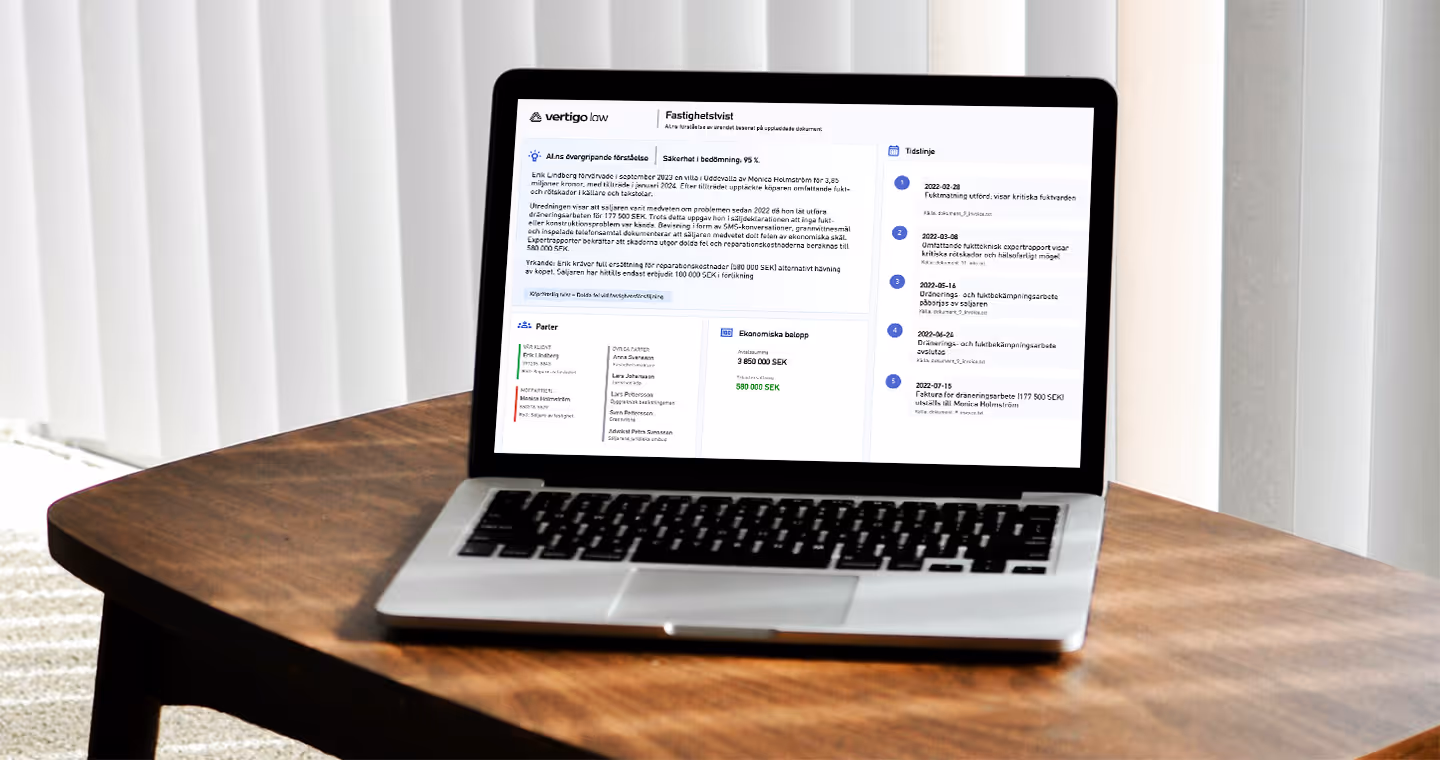 AI:n analyserar dokumenten och föreslår angreppsvinkar med styrkebedömning. Ni väljer, Vertigo Law skriver.